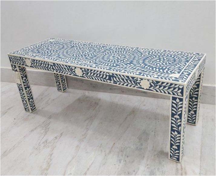 Indian traditional hand work crafted with white camel bone and blue color resin combination Rectangle designer bone inlay Console / Desk. This inlay work handmade by the artisan of Jot International Crafts. Bone inlay is a furniture-making process in which bits of wood or bone or shell are pressed into the design.
