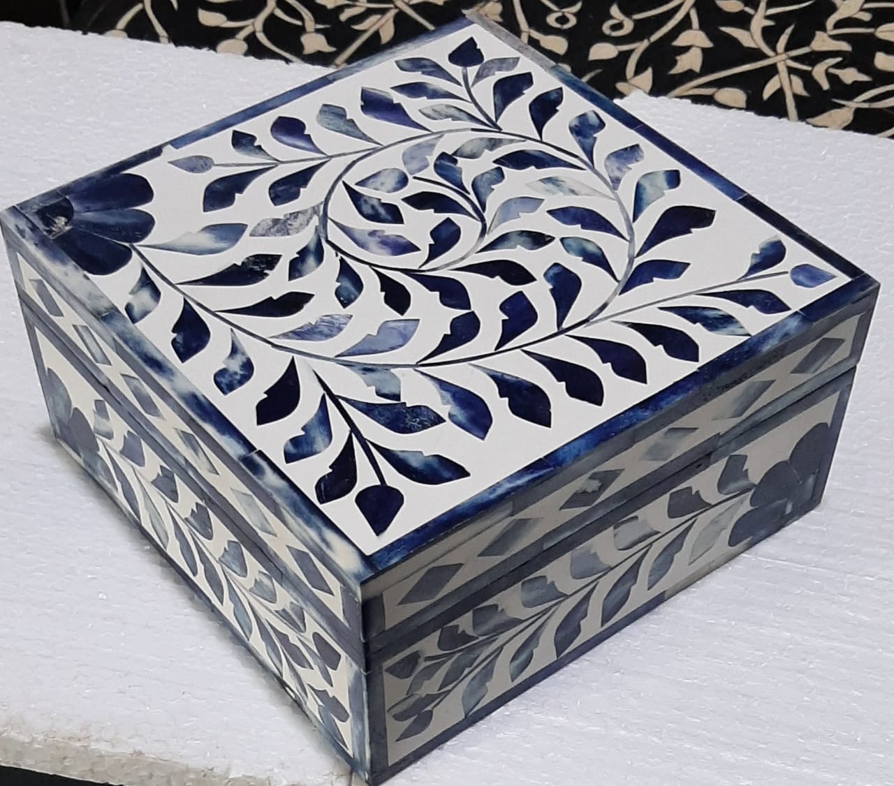 Dyed blue color bone crafted with white resin combination flower / leaf designer bone inlay square box .