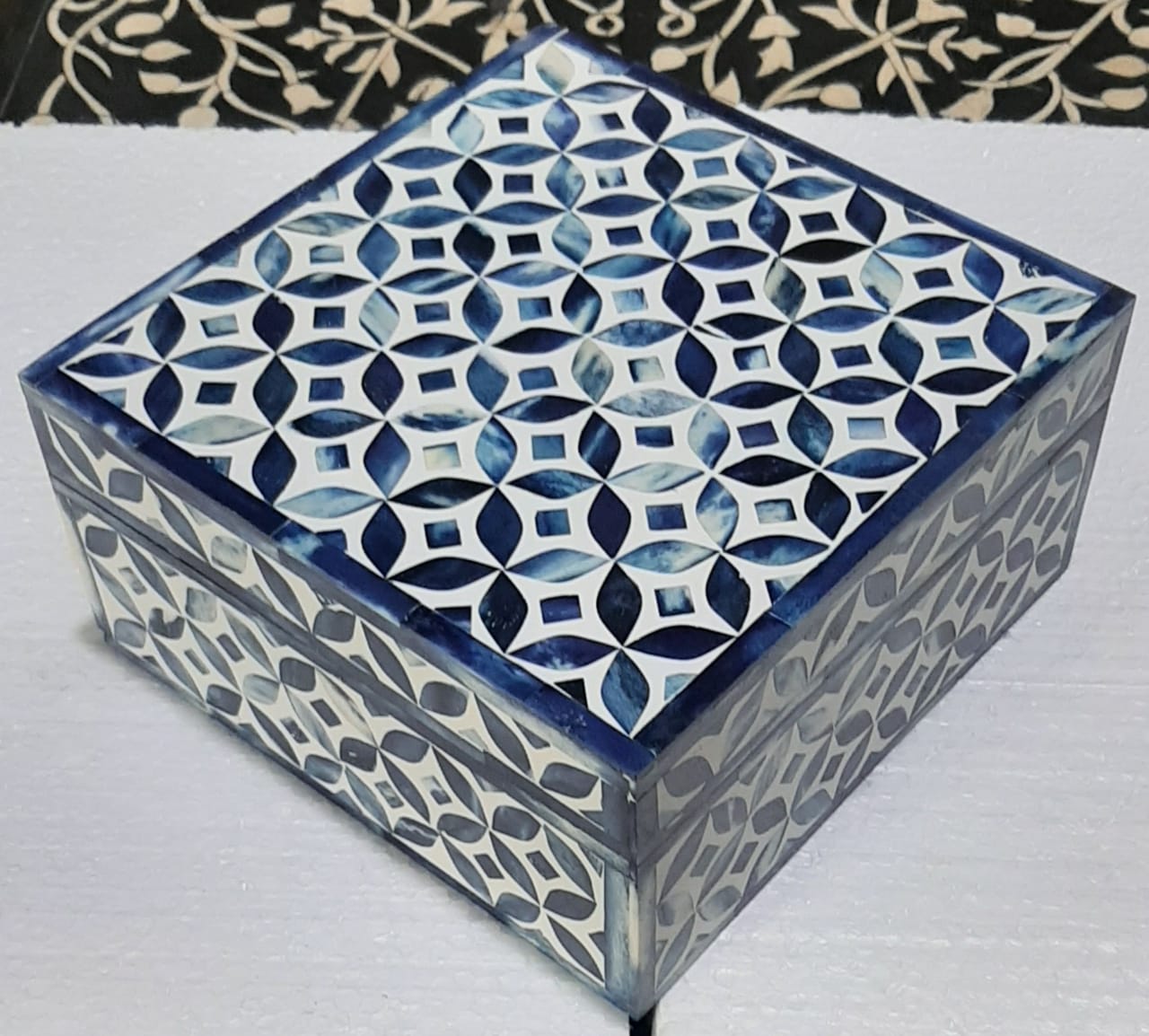 Dyed blue color bone crafted with white resin combination Moroccan designer bone inlay square box .