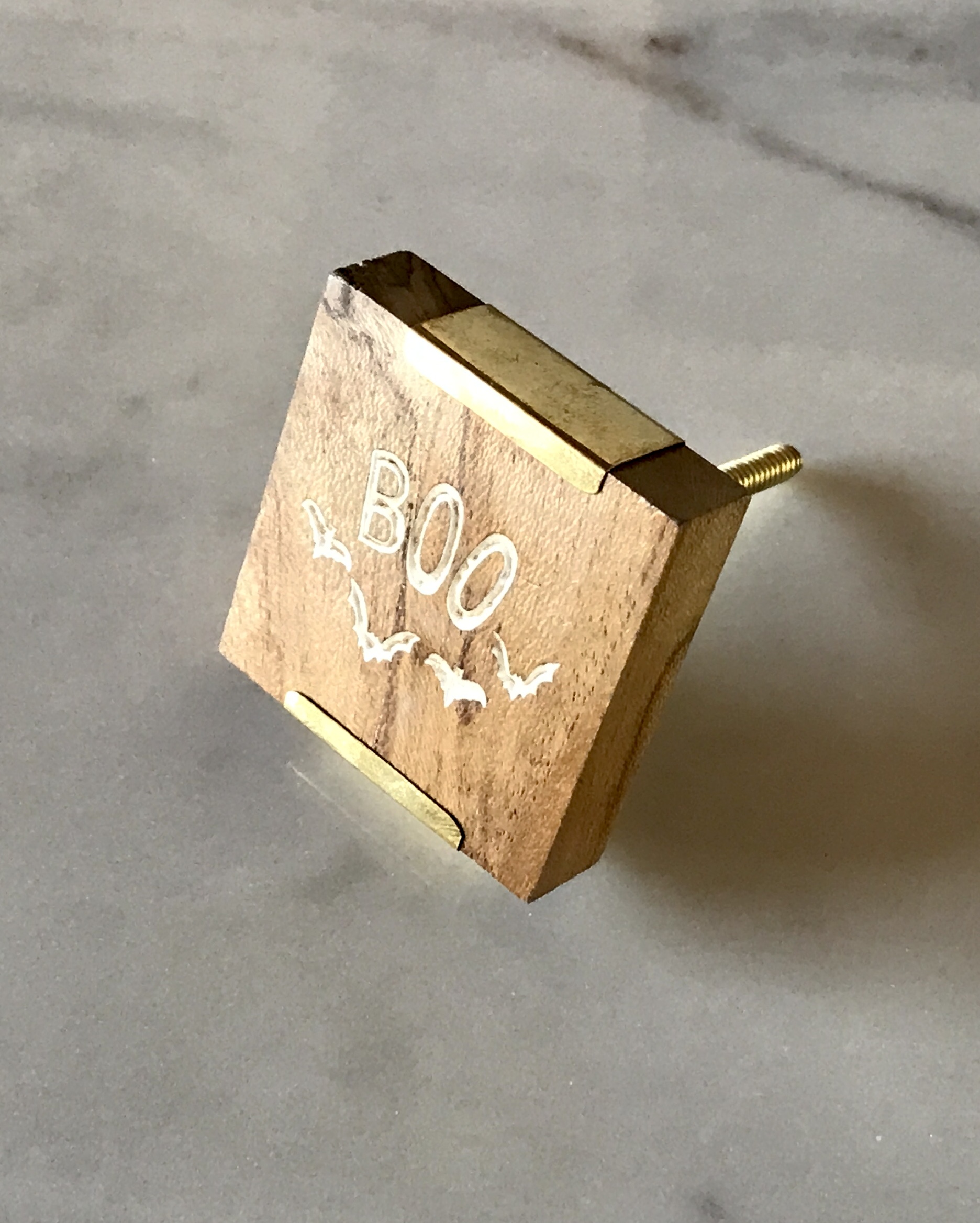 White color ‘Boo” etching design with brass combination square shape drawer knob , Suitable for any drawers and cabinets.