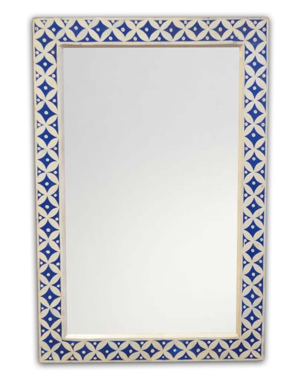 Dragon Eye designer natural white camel Bone with blue resin combination Rectangle shape bone inlay mirror. This inlay work handmade by the artisan of Jot International Crafts. Bone / mother of pearl / wood inlay is a furniture-making process in which bits of wood or bone or shell are pressed into the design.