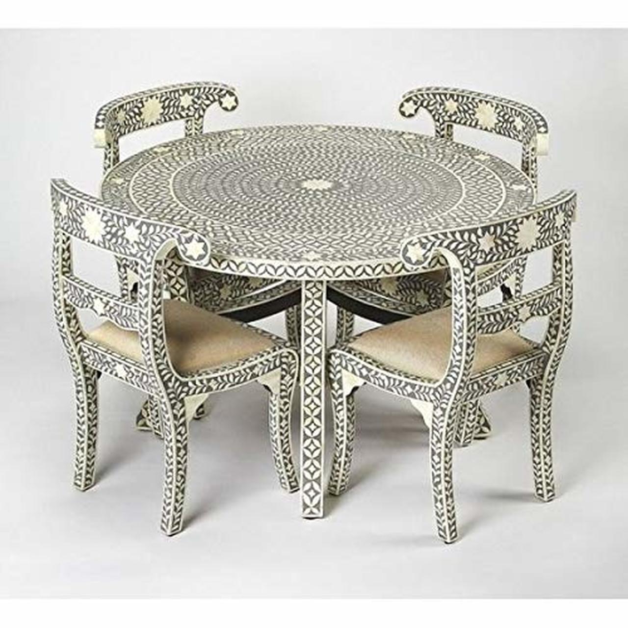 Natural camel white bone and grey color resin crafted with round dining table and four chairs  combination bone inlay Dining set  . This inlay work  handmade by the artisan of Jot International Crafts. Bone / mother of pearl / wood inlay is a furniture-making process in which bits of wood or bone or shell are pressed into the design.
