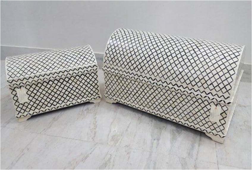 Mumtaj ( Mughal ) pattern with black color resin combination Bone Inlay designer Big Trunk / Storage Box . This Bone inlay handmade by the artisan of Jot International Crafts. Bone inlay is a furniture-making process in which bits of bone or shell are pressed into the design.