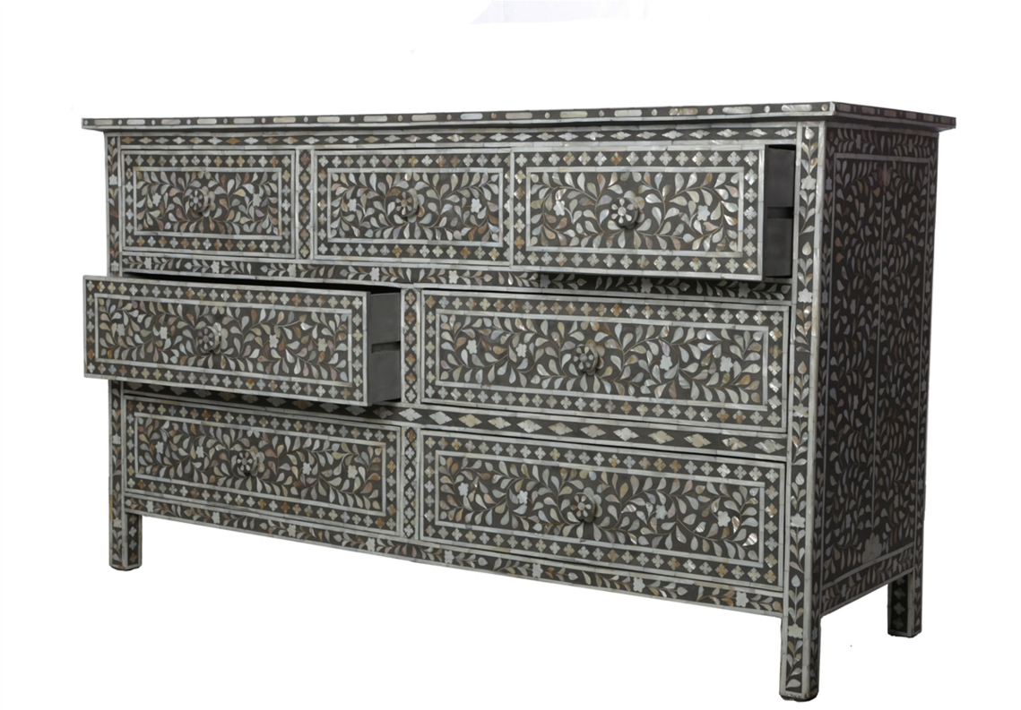 Natural Mother of pearl and grey color resin combination leaf , flower crafted seven drawer designer knobs Inlay Cabinet . This inlay work handmade by the artisan of Jot International Crafts. Bone inlay is a furniture-making process in which bits of bone or shell are pressed into the design.