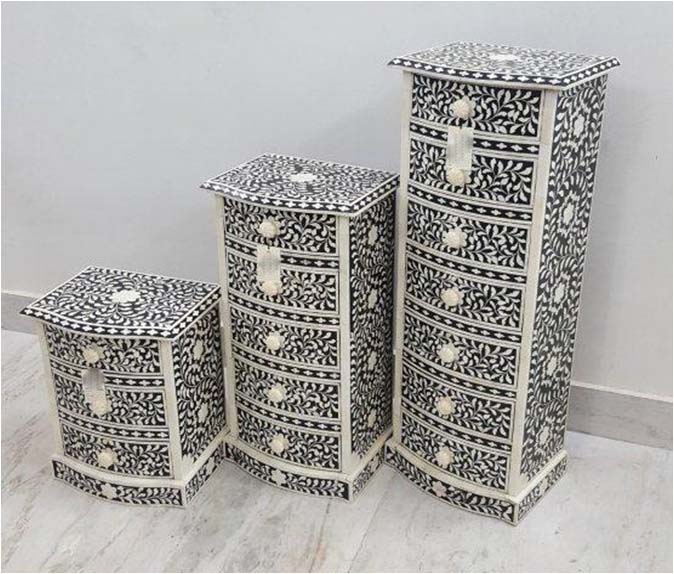 Black resin and white bone crafted tall and thin bone inlay designer chest drawer . This inlay work handmade by the artisan of Jot International Crafts. Bone inlay is a furniture-making process in which bits of wood or bone or shell are pressed into the design.