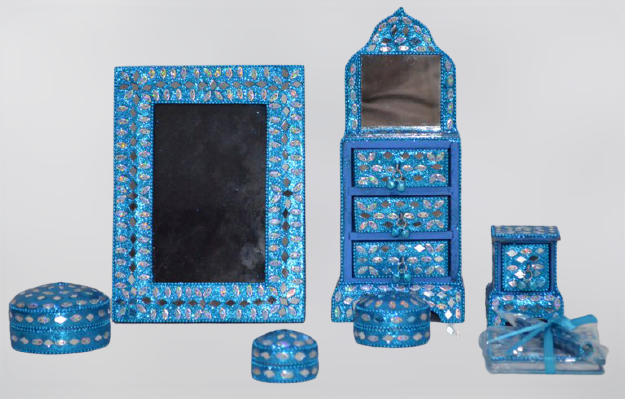 Decorate your sweet home with this type of decorative hand made turquoise color crafted box, frame, diary, drawer, mirror made of glitter , sea beads, glass beads , buttons and mdf ( pine wood )